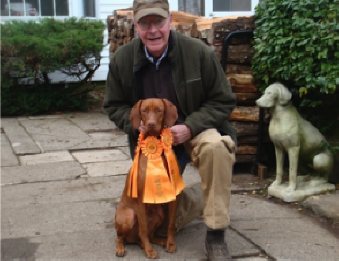 | Jackson Padilla owned by Ron and Ellen Padilla of Long Island, NY recently earned his JHA. Jackson is out of Spike's sister Delwood's Vizion Andrea Doria "Dory" and our Ch. Archiee, JH. | Rich Johnston in Pennsylvania with his dog Flint who earned his first leg of Jr Hunter on 9-20-14. Flint is out of our Ch. Lorrin, JH and 6xBISS Silver GCh. Just Spike, JH. Today, Oct. 5th Flint got all the qualifying scores needed to be a Junior Hunter before one year of age. Congratulations to Rick and Flint. |