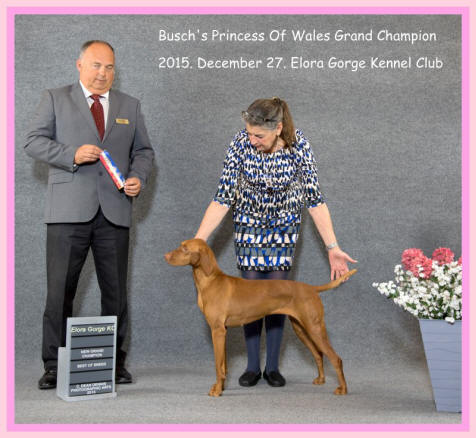 Irene Balla of Canada just informed me (January 2016) "Busch's Princess of Wales" is now a Grand Champion. "Didi" is out of Ch. Chicquitaa, JH and 6xBISS Silver Grand Ch. Just Spike, JH.