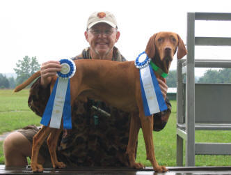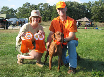 Donnor (pictured below)wins Derby stake at Vizsla Club of Eastern Iowa and his sister Ch. Zeeva, JH was third in the same stake. Later Zeeva won the Amateur Walking Derby stake. (Oct. 2010).